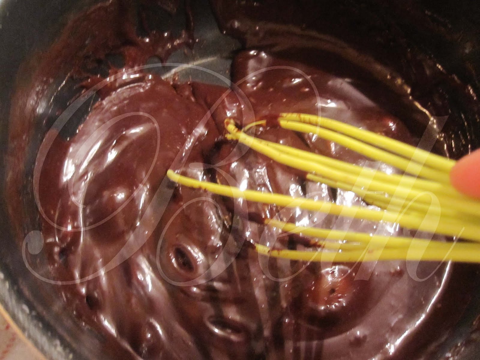 Bater o leite condensado, o chocolate e a manteiga, muito bem com uma colher de varas.